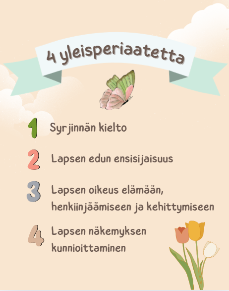 Lapsen oikeuksien sopimuksessa esitetään 4 yleisperiaatetta ja ne voidaan jakaa 1) syrjinnän kieltoon, 2) lapsen edun ensisijaisuuteen, 3) lapsen oikeuteen elämään, henkiinjäämiseen ja kehittymiseen sekä 4) lapsen näkemyksen kunnioittamiseen. Yleisperiaatteiden tarkoituksena on varmistaa, että kaikkia lapsia kohdellaan yhdenvertaisesti ilman syrjintää ja lasten asioissa ratkaisut tehdään heidän etunsa mukaan. Jokaiselle lapselle täytyy taata myös oikeus elämään ja turvalliseen kasvuun. Lisäksi on tärkeää, että heidän mielipiteitänsä kuunnellaan ja kunnioitetaan heidän ikä- ja kehitystasonsa mukaisesti.